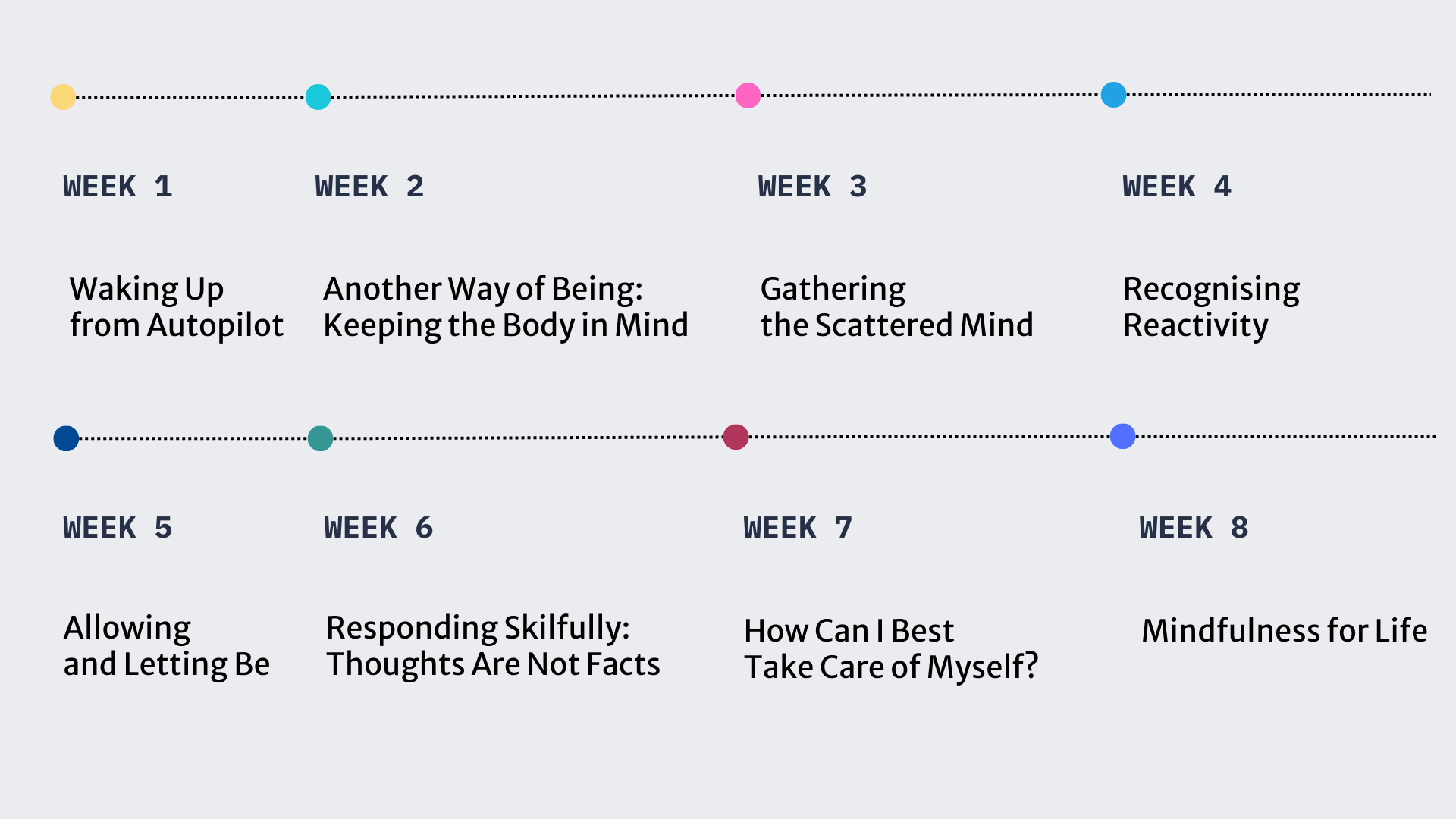 It is a skills-based, in-depth educational program designed to foster lasting change and help you integrate mindfulness into your daily life. Through a step-by-step learning process, this course helps you build foundational skills to recognize unhelpful thought and behavior patterns, break free from autopilot, and find moments of appreciation even in difficult times.